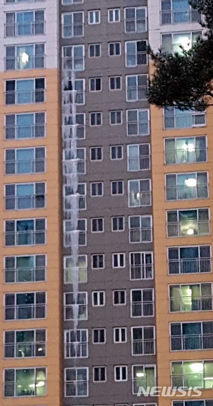 【양주=뉴시스】이경환 기자 = 지난 18일 오전 9시께 경기 양주시 덕정동의 한 아파트 10층 높이의 대형 고드름이 베란다 창문을 타고 길게 매달려 있다. 2017.12.20.(사진=양주소방서 제공)