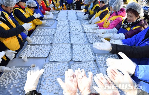 【부산=뉴시스】 하경민 기자 = 동지를 이틀 앞둔 20일 오전 부산 부산동구 부산진역 광장에서 적십자 봉사원과 삼성전기 부산사업장 직원 등이 지역 노인과 노숙인 등 300여 명에게 대접할 동지팥죽에 넣을 새알을 빚고 있다. 2017.12.20.