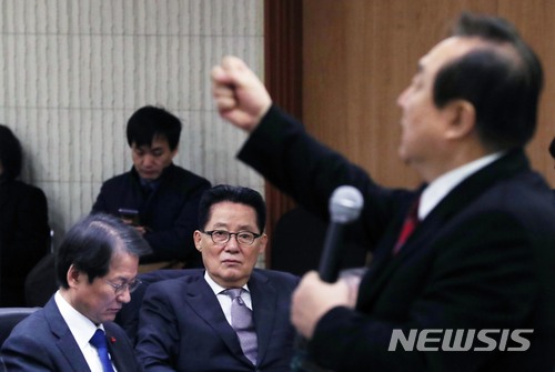 【서울=뉴시스】홍효식 기자 = 국민의당 박지원(왼쪽 둘째) 전 대표가 10일 오후 서울 영등포구 여의도 사학연금회관 회의실에서 열린 제90회 통일시민포럼 '우리에게 북한이란 무엇인가'에 참석해 정대철 상임고문의 강연을 듣고 있다. 맨 왼쪽은 천정배 의원. 2018.01.10.