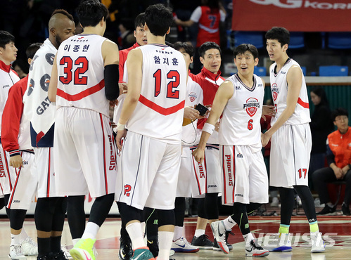 【서울=뉴시스】김선웅 기자 =11일 오후 서울 송파구 잠실학생체육관에서 열린 '2017-2018 정관장 프로농구 서울SK 나이츠와 울산 현대모비스피버스의 경기, 98대 92로 승리한 울산 선수들이 기뻐하고 있다. 2018.01.11.