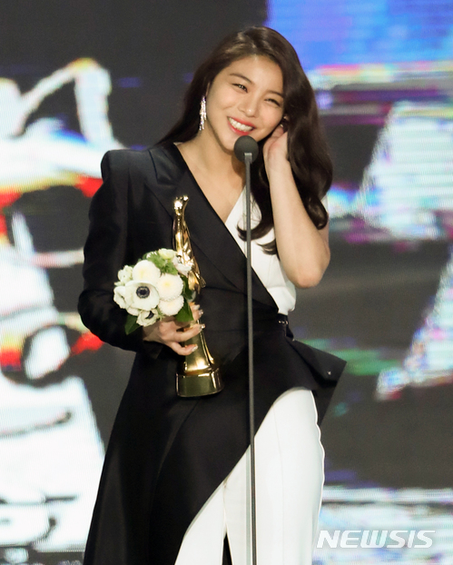 【서울=뉴시스】11일 경기 고양시 킨텍스에서 열린 제32회 골든디스크 음반부문 시상식에서 베스트OST상을 수상한 에일리가 소감을 말하고 있다. 2018.01.11. (사진=일간스포츠 제공)