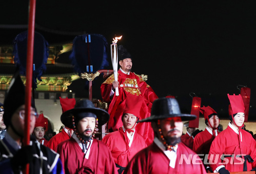 【서울=뉴시스】김진아 기자 = 13일 오후 서울 종로구 광화문 일대에서 2018 평창동계올림픽 성화 봉송 행사에 참가한 황실문화회 종친회 이홍배 이사장이 어가행렬로 성화를 봉송하고 있다. 2018.01.13.
