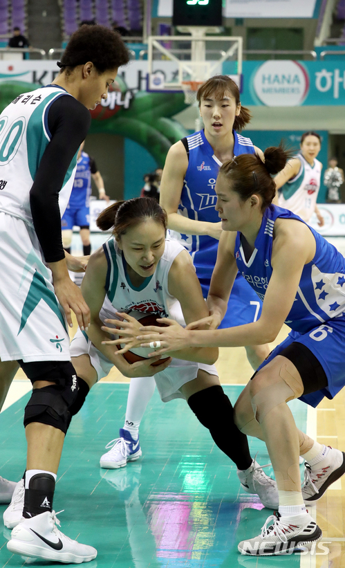 【부천=뉴시스】권현구 기자 = 15일 오후 경기도 부천실내체육관에서 열린 2017-2018 신한은행 여자프로농구 부천 KEB 하나은행과 아산 우리은행 위비의 경기, 하나은행 염윤아가 리바운드 하고 있다. 2018.01.15.