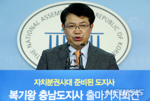 【서울=뉴시스】이영환 기자 = 복기왕 충남 아산시장이 16일 오후 서울 여의도 국회 정론관에서 충남도지사 출마 선언 기자회견을 하고 있다. 2018.01.16. [email protected]