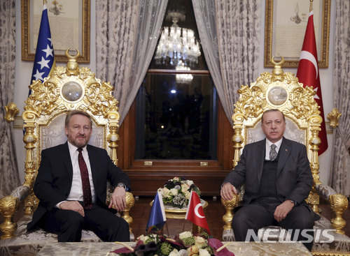 【이스탄불=AP/뉴시스】 터키의 레셉 타이이프 에르도안 대통령(오른쪽)이 28일 저녁 보스니아-헤르체고비나의 3인 대통령단 일원인 바키르 이젯베고치 무슬림 대통령을 오토만궁에서 만나 포즈를 취하고 있다. 터키는 중동 이전 '근동' 근대사 시절 오스만(오토만) 튀르크 제국으로 이슬람 패권을 휘둘렀다. 2018. 1. 29.