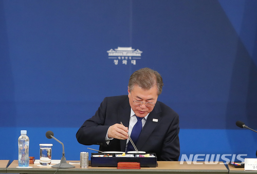 【서울=뉴시스】문재인 대통령이 30일 오후 청와대 영빈관에서 열린 장ㆍ차관 워크숍에서 참석자들과 도시락으로 만찬을 하고 있다.  2018.01.30. (사진=청와대 제공)