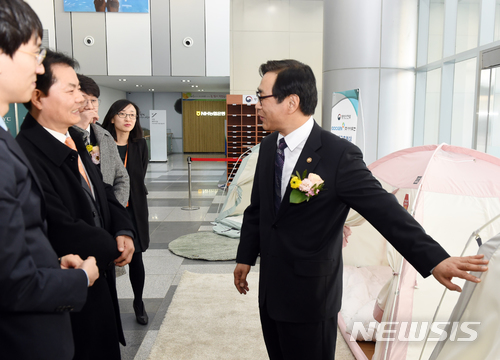 【서울=뉴시스】 류희인 행정안전부 재난안전관리본부장이 7일 오전 세종시 정부세종청사 1층 로비에서 열린 '이재민 구호용 텐트 전시장'에 참석해 관계자들과 텐트 성능장비 전시를 둘러보고 있다.2018.02.07. (사진=행정안전부 제공)