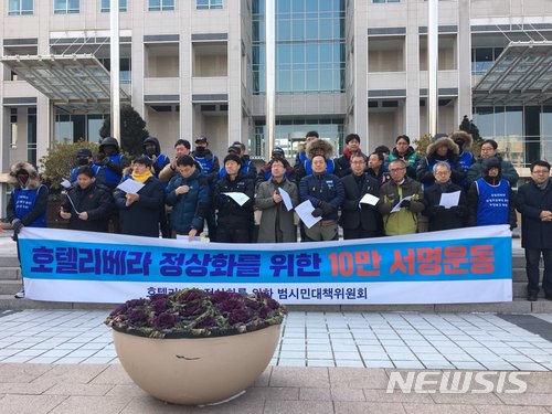 【대전=뉴시스】조명휘 기자 = 호텔리베라유성 정상화를 위한 범대전시민대책위원회와 리베라호텔 노동조합원 등이 8일 오전 대전시청 북문에서 기자회견을 열고 10만 서명운동 돌입을 선언하고 있다. 2018.02.08.