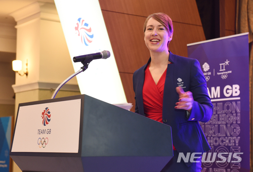 【서울=뉴시스】 8일 강원도 평창군 용평리조트에서 영국 선수단 환영 리셉션이 열린 가운데 영국 컬링 국가대표인 리지 야놀드 선수가 개막식 기수자 선정 소감을 밝히고 있다. 2018.02.08. (사진 =주한영국대사관 제공)