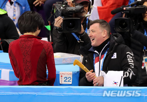 【강릉=뉴시스】박주성 기자 = 한국 피겨스케이팅 남자 싱글 국가대표 차준환이 9일 오전 강원도 강릉 아이스아레나에서 열린 팀이벤트 쇼트프로그램에서 연기를 마친 후 브라이언 오서 코치와 이야기를 나누고 있다. 2018.02.09.
