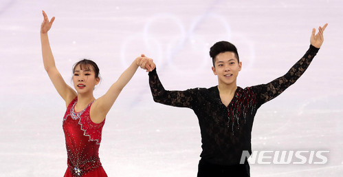【강릉=뉴시스】추상철 기자 = 14일 오후 강원 강릉 아이스아레나에서 열린 피겨스케이팅 페어 쇼트 프로그램 경기. 대한민국 김규은-감강찬이 연기를 마친후 인사하고 있다. 2018.02.14.