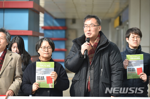 【대구=뉴시스】우종록 기자 = 정치개혁 대구시민행동과 지방분권운동 대경본부 관계자들이 14일 오후 대구시 동구 신암동 동대구역 앞 광장에서 기자회견을 열고 개헌과 정치개혁을 촉구하고 있다. 2018.02.14.