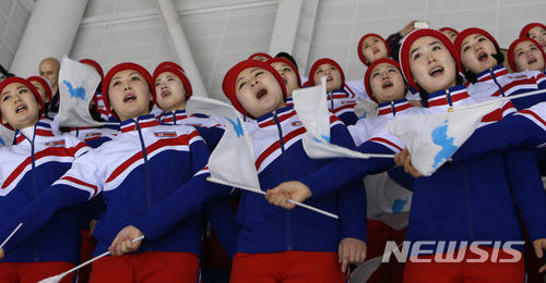 【강릉=뉴시스】김경목 기자 = 14일 오후 북한 응원단이 강원 강릉시 관동하키센터에서 2018평창동계올림픽대회 여자아이스하키 남북 단일팀(코리아)과 일본과의 B조 예선 마지막 3차전 응원을 하고 있다. 2018.02.14.