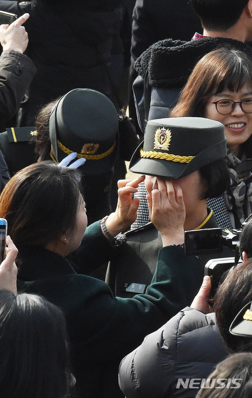 【대전=뉴시스】함형서 기자 = 20일 오후 대전 유성구 국군간호사관학교 연병장에서 국군간호사관학교 제 62기 신입생도 입학식에서 부모님이 딸의 눈물을 닦아주고 있다. 2018.02.20.