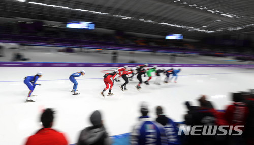 【강릉=뉴시스】추상철 기자 = 24일 오후 강원 강릉 스피드 스케이팅 경기장에서 열린 2018 평창 동계올림픽 스피드 스케이팅 여자 매스스타트 준결승 경기. 박지우(왼쪽 두번째)를 비롯한 선수들이 역주하고 있다. 2018.02.24.