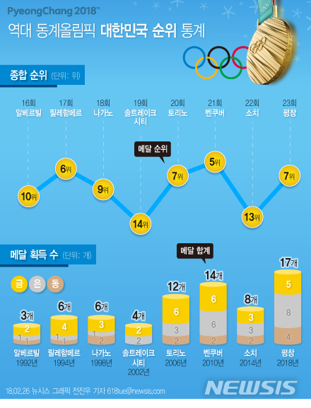 【서울=뉴시스】전진우 기자 = 대한민국 국가대표 선수단이 2018 평창 동계올림픽대회에서 금메달 5개, 은메달 8개, 동메달 4개 등 역대 동계올림픽 최대 메달(총 17개)을 획득했다. 다음은 역대 동계올림픽 대한민국 순위 통계.