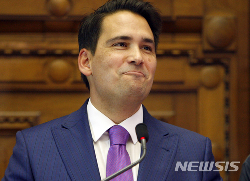 【웰링턴(뉴질랜드)=AP/뉴시스】원주민 마오리족 출신으로는 사상 처음으로 27일 보수 성향인 뉴질랜드 국민당의 당대표로 선출된 사이먼 브리지스. 그는 2020년 총선에서 승리하면 사상 첫 마오리족 출신 총리가 된다. 2018.2.27