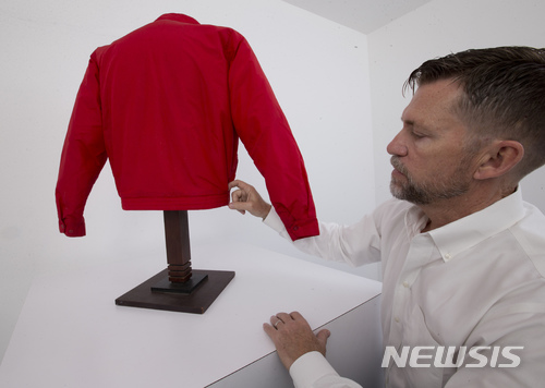 【 웨스트 팜비치=AP/뉴시스】미국 영화배우 제임스 딘이 1955년작 '이유없는 반항'에 입고 출연했던 붉은 색 점퍼가 12일(현지시간) 플로리다주 웨스트 팜비치 모던 옥션 전시장에 진열되고 있다. 이 점퍼는 오는 3월 3일 경매에 부쳐진다.2018.2.27