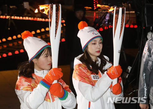 【서울=뉴시스】박진희 기자 =  '피겨여왕' 김연아와 시각장애인 크로스컨트리·바이애슬론 꿈나무 봉현채 선수가 3일 오후 서울 송파구 올림픽공원 평화공원에서 2018 평창 동계패럴림픽 성화를 봉송하고 있다. 2018.03.03.