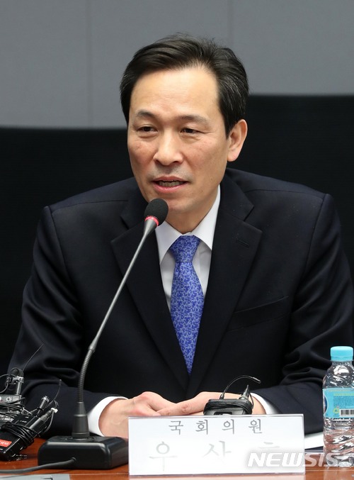 【서울=뉴시스】홍효식 기자 = 9일 오후 서울 여의도 국회 의원회관 제2세미나실에서 열린 '탄핵을 넘어 새 시대를 향한 입법 및 정책과제' 탄핵 1주년 기념 국회-시민사회 대토론회에서 6·13 지방선거 서울시장 출마 의사를 밝힌 더불어민주당 우상호 의원이 축사하고 있다. 2018.03.09.