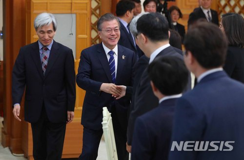 【서울=뉴시스】전신 기자 = 문재인 대통령이 13일 청와대 충무실에서 열린 국민헌법자문특위 초청 오찬에서 위원들과 인사하고 있다. 2018.03.13.