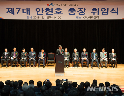 【시흥=뉴시스】김지호 기자 = 15일 오후 한국산업기술대학교에서 열린 '제7대 안현호 총장 취임식'에서 안 신임 총장이 취임사를 하고 있다. 2018.03.15 (사진=한국산업기술대학교 제공)