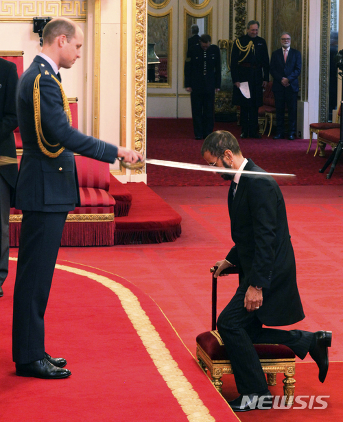 【런던=AP/뉴시스】 20일 전 비틀스 멤버인 링고 스타가 버킹엄 궁에서 왕세손 윌리엄 왕자로부터 기사 작위를 부여 받고 있다. 2018. 3. 20.