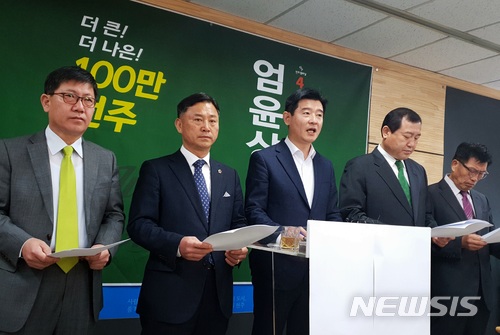 【전주=뉴시스】윤난슬 기자 = 엄윤상 변호사(51)가 22일 오전 전북 전주시청 브리핑룸에서 오는 6·13 지방선거 전주시장직 출마를 공식 선언하고 있다. 2018.03.22.