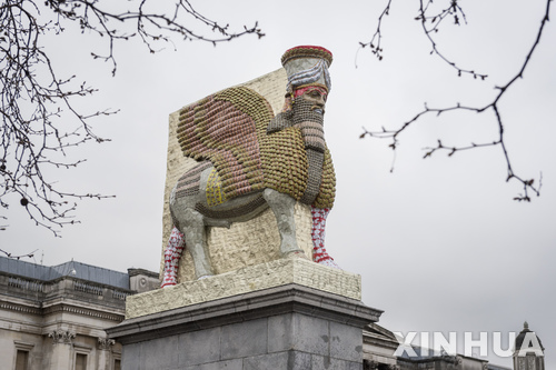 【런던=신화/뉴시스】28일 런던 트라팔가 광장에 첫 선을 보인 '보이지 않는 적은 없다' 제목의 조각상. 마이클 래커위츠가 제작한 이 라마수(인면수신상, 人面獸身像) 조각상은 이라크로부터 공수해온 1만500개의 빈 깡통을 이용해, 2015년 이슬람국가(IS)에 의해 파괴된 날개달린 황소상을 본따 만들어졌다. 2018.3.29