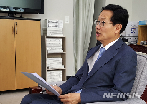 【청주=뉴시스】이병찬 기자 = 충북지사 선거 출마를 선언한 오제세(청주 서원) 국회의원이 2일 충북도청 기자실에서 기자간담회를 하고 있다.2018.04.02. [email protected]