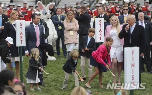 【워싱턴=AP/뉴시스】2일 워싱턴 백악관에서 연례 부활절 달걀 굴리기 대회가 열린 가운데 도널드 트럼프 대통령이 자신의 손주들이 참가한 대회의 시작을 알리는 호루라기를 불고 있다. 2018.4.3