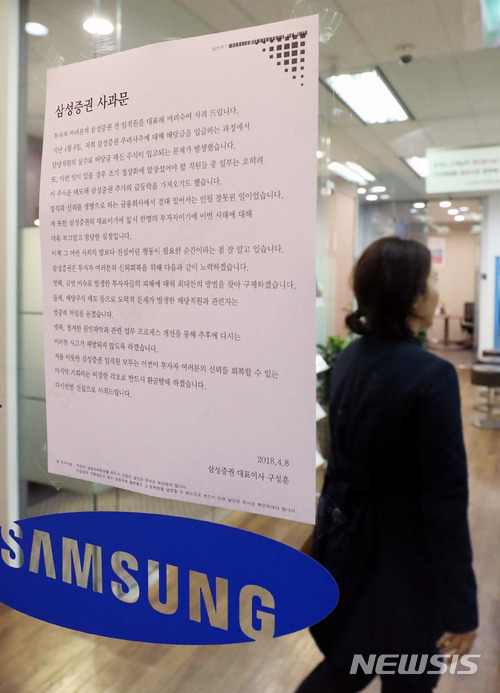【서울=뉴시스】임태훈 기자 = 금융감독원이 삼성증권 배당 사고에 대해 특별점검한다고 밝힌 9일 오후 서울 시내의 삼성증권 지점에 구성훈 대표이사 명의 사과문이 게시돼 있다.