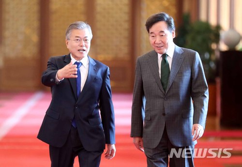 【서울=뉴시스】전진환 기자 = 문재인 대통령이 10일 오전 청와대 세종실에서 열린 국무회의에 참석하고 있다. 오른쪽은 이낙연 국무총리. 2018.04.10. [email protected]