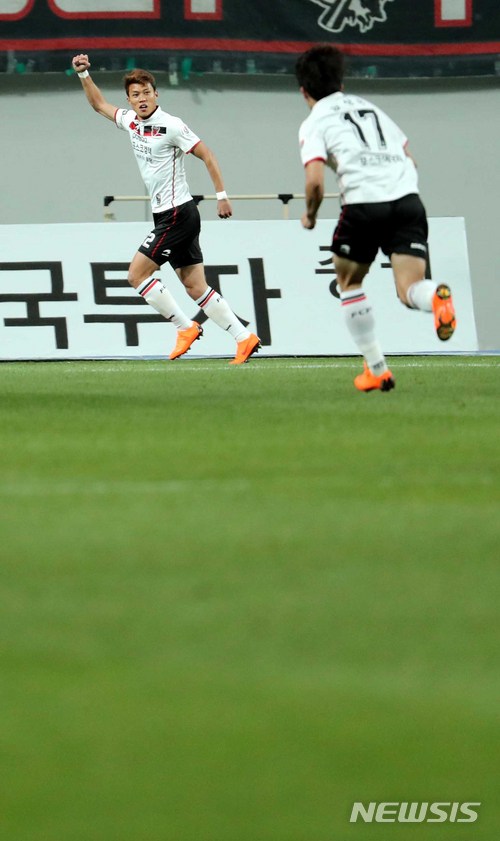 【서울=뉴시스】고범준 기자 = 11일 오후 서울 마포구 서울월드컵경기장에서 열린 '2018 KEB 하나은행 K리그1(클래식) FC서울과 포항 스틸러스의 경기, 포항 김승대(12번, 왼쪽)가 전반 골을 넣고 기뻐하고 있다. 2018.04.11.