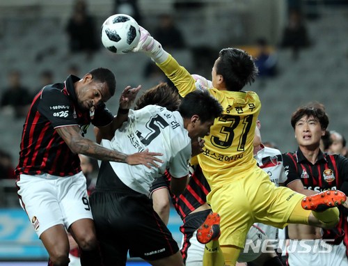 【서울=뉴시스】고범준 기자 = 11일 오후 서울 마포구 서울월드컵경기장에서 열린 '2018 KEB 하나은행 K리그1(클래식) FC서울과 포항 스틸러스의 경기, 포항 강현무 GK가 펀칭을 하고 있다. 2018.04.11.