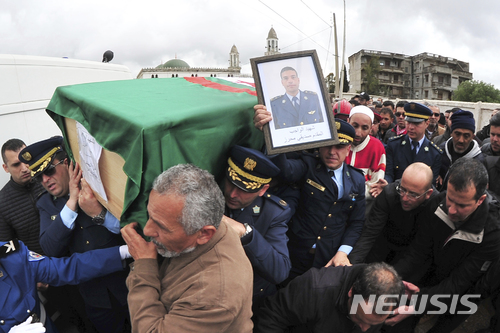 【히드라(알제래)=AP/뉴시스】알제리 수도 알제 인근 히드라의 시디-야히아 묘지에서 15일 추모객들이 알제리 국기로 뒤덮힌 사디키 마흐레즈의 시신이 든 관을 운구하고 있다. 마흐레즈는 257명이 사망한 알제리 최악의 군 수송기 추락 사고의 부조종사였다. 2018.4.16