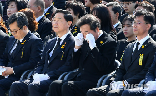 【안산=뉴시스】임태훈 기자 = 4.16 세월호 참사 4주기인 16일 안산 화랑유원지에서 열린 ‘4.16 세월호 참사 희생자 정부 합동 영결·추도식’에서 이낙연 국무총리가 눈물을 닦고 있다. 2018.04.16.