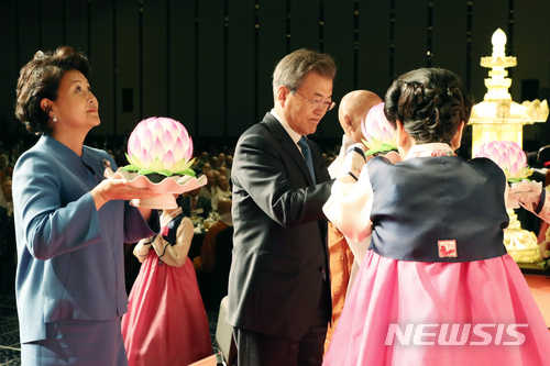 【서울=뉴시스】전신 기자 = 문재인 대통령과 부인 김정숙 여사가 17일 서울 삼성동 그랜드 인터컨티넨탈 서울 파르나스에서 열린 한반도 안정과 평화를 위한 기원법회에서 육법공양을 하고 있다. 2018.04.17.
