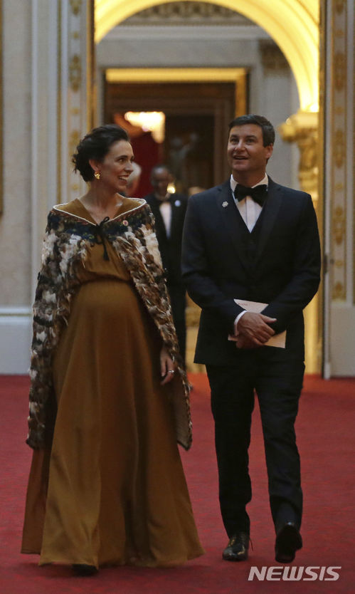 【 런던=AP/뉴시스】재신더 아던 뉴질랜드 총리(왼쪽)가 19일(현지시간) 영국 런던 버킹엄궁에서 드레스 위에 마오리족 전통의상 '카후 후루후루'를 어깨에 걸치고 연인 클라크 게이퍼드와 함께 영연방 정상회의에 참헉하기 위해 걸어가고 있다. 2018.04.20