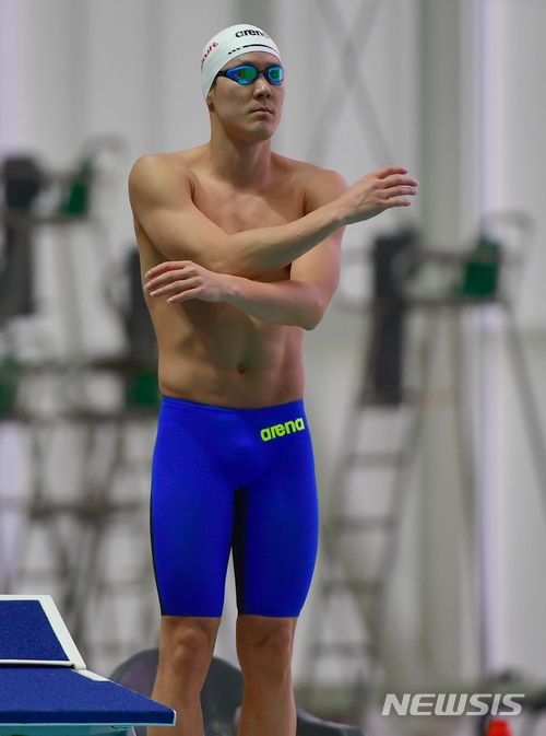 【광주=뉴시스】류형근 기자 = 29일 오전 광주 광산구 남부대시립국제수영장에서 '2018 국제대회 수영국가대표 선발대회'가 열린 가운데 박태환(인천)이 남자일반부 자유형 200m 예선 경기에 앞서 몸을 풀고 있다. 2018.04.29.