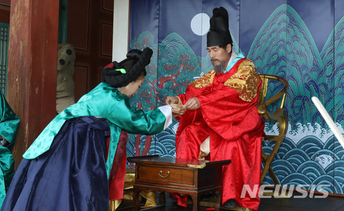 【서울=뉴시스】임태훈 기자 = 2일 오후 서울 종로구 창덕궁 성정각에서 열린 '왕실내의원' 체험 행사에서 관계자들이 전통복장을 갖추고 임금이 진료받는 모습을 시연하고 있다. 2018.05.02.