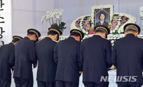 【익산=뉴시스】강명수 기자 = 3일 故 강연희 소방경의 영결식이 열린 전북 익산소방서에서 동료 소방관들이 헌화하며 마지막을 함께 하고 있다. 故 강 소방경은 취객을 구조하던 중 폭행 당한 후 스트레스를 호소하다 뇌출혈로 쓰러져 치료를 받던 중 숨졌다. 2018.05.03.