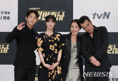 【서울=뉴시스】조수정 기자 = tvN 새 토일드라마‘무법변호사’ 제작발표회가 열린 8일 오후 서울 영등포 타임스퀘어에서 배우들이 포즈를 취하고 있다. 왼쪽부터 이준기, 서예지, 이혜영, 최민수. ‘무법변호사’는 12일부터 매주 토, 일 밤 9시 방송된다. 2018.05.08. [email protected]