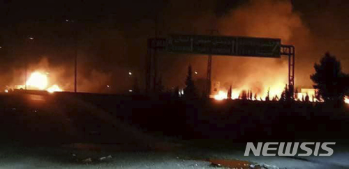 【다마스쿠스( 시리아) = SANA·AP/뉴시스】 시리아 국영 SANA통신이 9일 배포한 다마스쿠스 인근 키스웨 군사기지의 피격 사진. 시리아 공군은 이스라엘이 발사한 것으로 보이는 미사일중 2기를 8일 중도 파괴했다고 발표했다. 이번 공격은 트럼프 미 대통령의 이란 핵합의 파기선언 후 이뤄졌으며 주로 시리아 정부를 지원하는 이란 군인들이 피해를 입었다. 2018.05.09