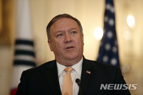 【워싱턴=AP/뉴시스】 마이크 폼페이오 미 국무장관이 11일(현지시간) 미국 워싱턴 국무부 청사에서 열린 한미 외교장관 회의 직후 기자회견을 갖고 있다. 2018. 5. 12.