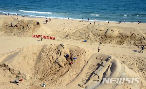 【부산=뉴시스】 하경민 기자 = 13일 부산 해운대해수욕장을 찾은 시민과 관광객들이 다양한 모래조각 작품을 구경하고 있다.