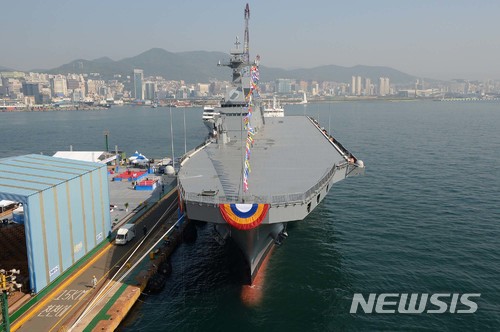 마라도함은 길이 199m, 폭 31m 크기로 상륙병력, 헬기, 전차 등을 탑재할 수 있다. 사진은 진수준비중인 마라도함 모습. 2018.05.14. (사진=방위사업청 제공)