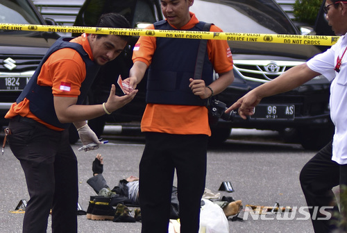 【 페칸바루=AP/뉴시스】 인도네시아 수마트라섬 리아우 주 페칸바루에서 16일 테러범들이 미니밴으로 경찰본부를 들이받은 후 칼로 경찰관들을 공격하는 사건이 발생했다. 경찰은 용의자 4명은 현장에서 사살됐고, 운전자 1명은 도주했으나 체포됐다고 말했다. 사진은 경찰들이 현장을 조사하는 동안 용의자의 시신 한 구가 길바닥에 쓰러져 있는 모습. 2018.05.16