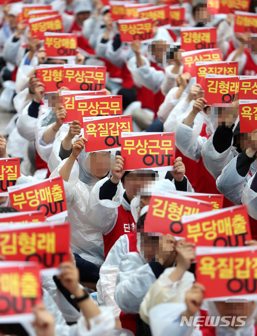 【서울=뉴시스】 추상철 기자 = 한국오라클노동조합이 16일 오전 서울 강남구 아셈타워 앞에서 근로조건 개선 쟁의행위에 돌입, 1차 파업 집회를 하고 있다. 2018.05.16.