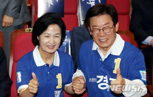 【서울=뉴시스】이종철 기자 = 16일 오후 서울 여의도 국회 의원회관에서 열린 더불어민주당 중앙선대위 출정식에서 추미애 대표와 이재명 경기지사 후보가 파이팅을 하고 있다. 2018.05.16.